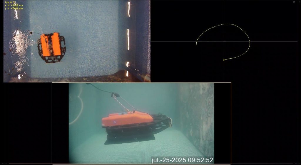 Exemple de suivi de trajectoire par le robot sous-marin HOMER durant les expérimentations du projet (vue de dessus, trajectoire, vue sous-marine de profil).